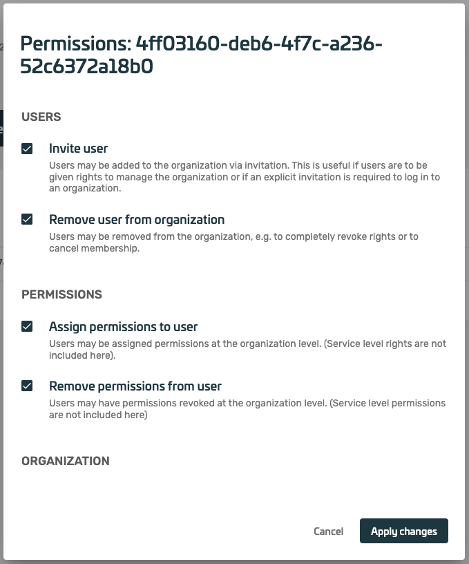 The Users & Permissions section lets the admin configure meberships and permissions of the users associated with the organization.