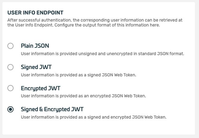 The User Info Endpoint lets the admin configure the encoding of the token that can be retrieved from the user info endpoint after a successful authentication: